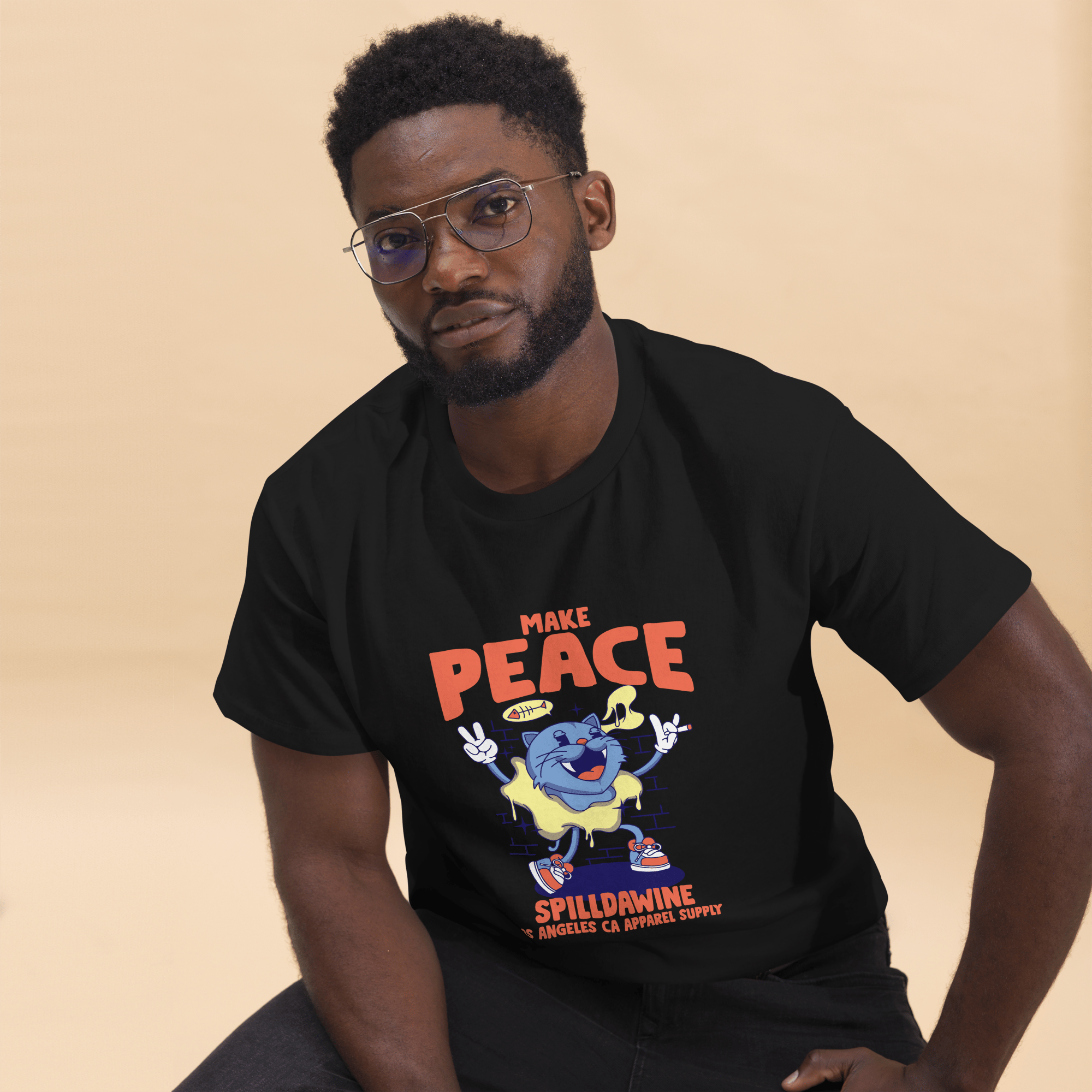 Featuring our exclusive Make Peace graphic, this tee blends streetwear energy with a timeless message of positivity. Designed in Los Angeles by Spilldawine Apparel Supply, it’s more than just a shirt—it’s a statement piece that carries both style and meaning.